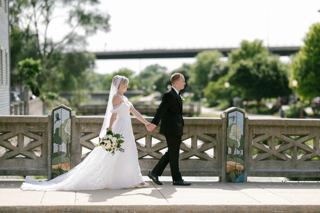 Allie & Connor’s wedding at The Bridge Lemont blended timeless black-tie style with personal, playful touches—think white florals, candlelight, downtown portraits, and a custom tattoo station. From an emotional first look just steps outside the venue to a packed dance floor and candlelit reception, their day was the perfect mix of romance and fun.
